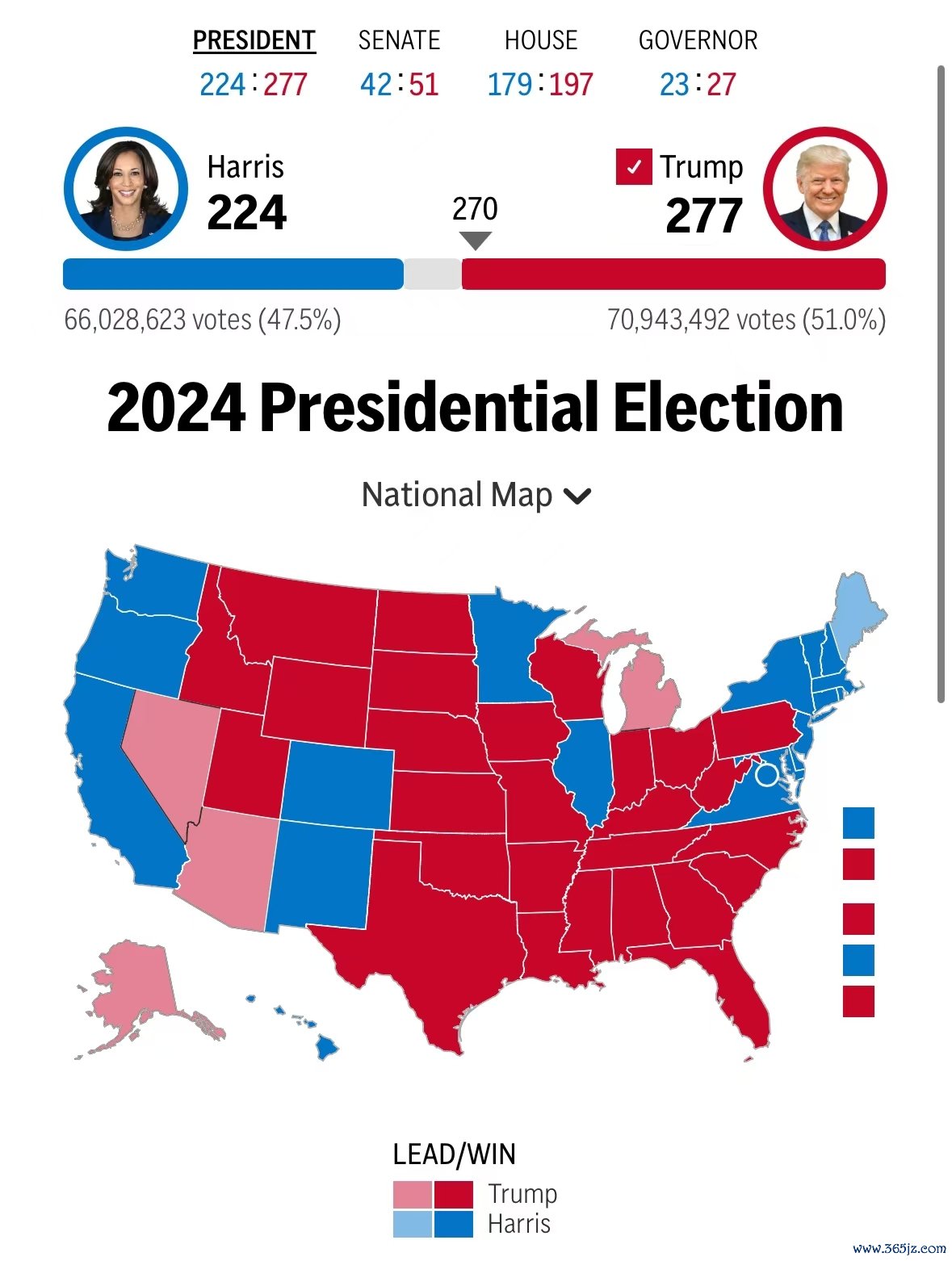 目前众议院选举的计票工作正在进行中,控制权归属尚未确定。根据美联社的测算,目前共和党与民主党在众议院分别获得190席和169席。成为众议院多数党需要至少218席。